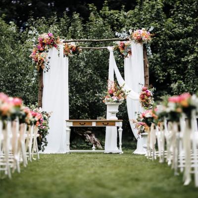 Inspirée de la tradition américaine, la cérémonie en extérieur s’illustre souvent par une arche fleurie, une allée décorée, des chaises ou bancs harmonieusement disposés… Mais chaque décoration doit refléter votre couple. Le moment fort de la cérémonie peut être souligné par des rituels symboliques – classiques ou originaux – comme l’échange des vœux ou des alliances, le rituel du sable, du vin, du cocktail, ou encore la bibliothèque des amoureux. Autant de gestes pour ancrer l’instant dans votre histoire.